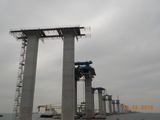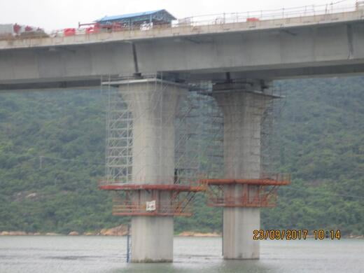 The main contract was for the over sea bridge connecting Hong Kong to Macau and Zhuhai. We were the primary scaffolding contractor for this project. We carried out two packages for this job. One was to design, supply and build access towers around the piers providing access to government officials in carrying out rebound hammer and coring test to assess the density of the concrete piers. Another was to supply grade A especially trained scaffolders for erection of pier head suspended access reaching up to 45 meters above pile cap.